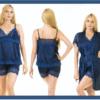 Add a touch of elegance to your nightwear collection with this 3-Piece Teal Satin Nightwear Set. Designed with silky smooth satin and delicate lace detailing, this set includes a lace camisole top, matching shorts, and a satin robe to complete the luxurious look.