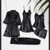 Elegant 5-piece black satin nightwear set featuring a lace-trim robe, slip dress, cami top, shorts, and trousers. Soft, silky, and perfect for bridal wear, gifting or luxury nightwear.